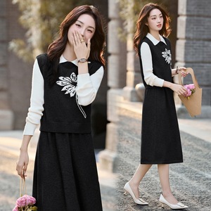 温柔风绣花针织马甲连衣裙女2025秋冬新款时尚气质收腰显瘦两件套