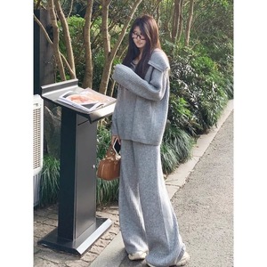 灰色大翻领拉链针织时尚套装女秋冬新款宽松慵懒风阔腿裤两件套厚