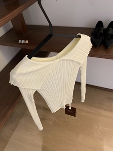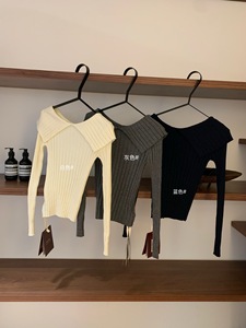 WGWE7191十三行女装2025秋装新款一字肩大翻领长袖露肩上衣针织衫