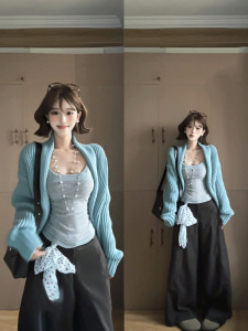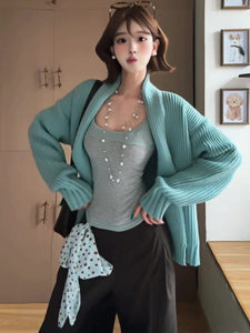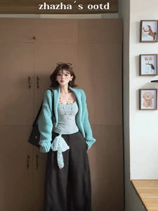 韩系松弛感穿搭蓝色宽松毛衣开衫慵懒风超好看针织衫外套2025秋季