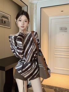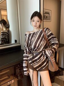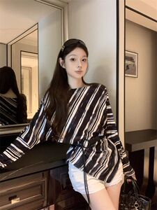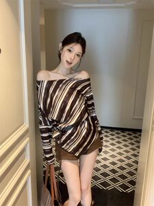 不规则斜肩条纹T恤女早秋新款独特露肩绑带收腰显瘦百搭长袖上衣