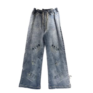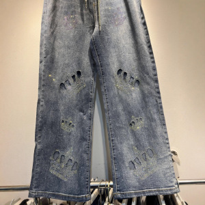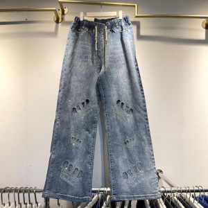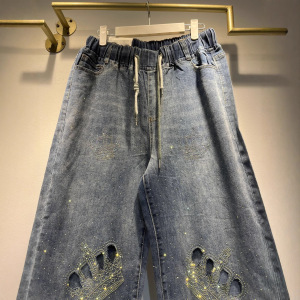 欧洲站重工镂空烫钻皇冠牛仔裤女高腰显瘦阔腿裤2025秋冬新款