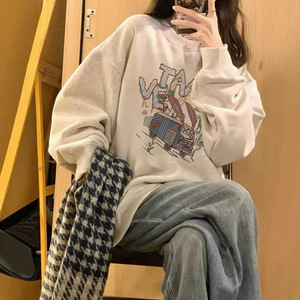 美式慵懒chic无帽卫衣女春秋薄款oversize宽松外套小个子圆领上衣