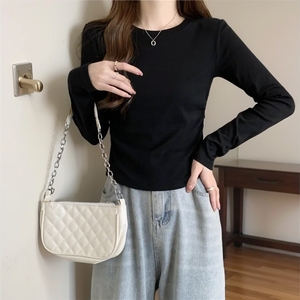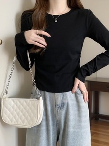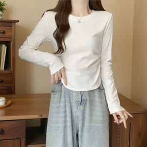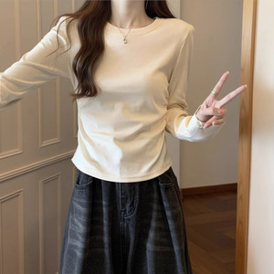 正肩圆领褶皱收腰长袖t恤女春秋季内搭打底衫可外穿修身短款上衣