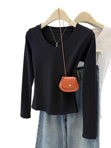 白色正肩V领长袖T恤女早春秋修身韩版内搭打底衫chic甜辣收腰上衣