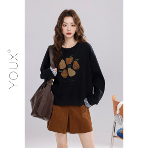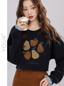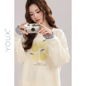 又巷【小梨挂月】刺绣格子袖卫衣女2025秋新款复古拼接假两件上衣