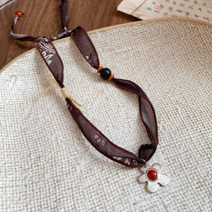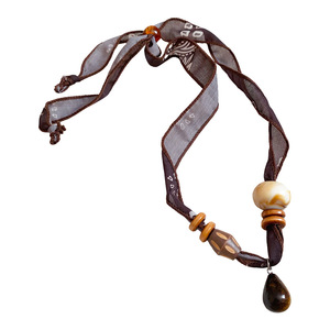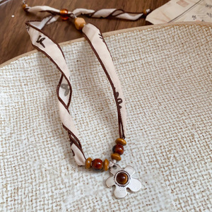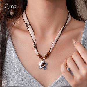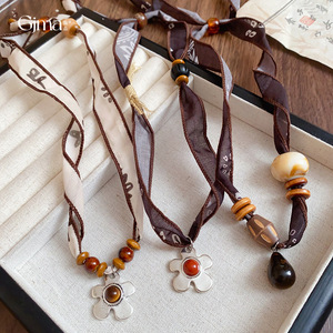 复古秋冬木头串珠布艺花朵项链轻奢高级感锁骨链时尚个性独特项饰