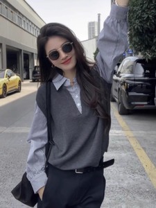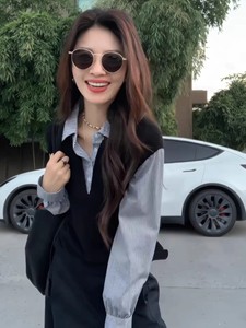 假两件长袖衬衫女高级感设计感小众早秋韩系chic别致针织衫上衣