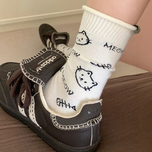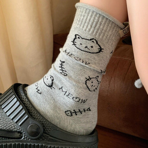 卡通袜子女2025秋季新款可爱小猫中筒袜韩版布标ins潮堆堆袜无骨