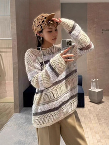 25秋季新款长袖女气质宽松遮肉显瘦慵懒感时髦落肩条纹针织衫