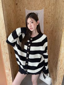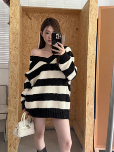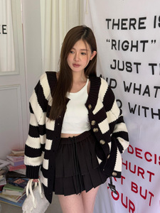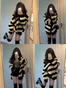ME KAKAMEE十三行秋韩系慵懒条纹两面穿大版宽松开衫毛衣女 A2887