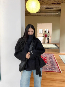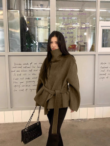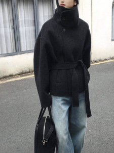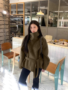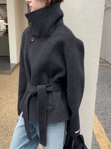 欧美跨境秋冬新款高级感时尚气质系带包裹感复古高领毛呢短外套女