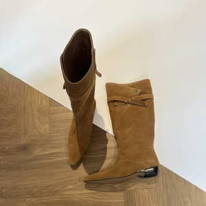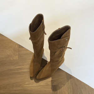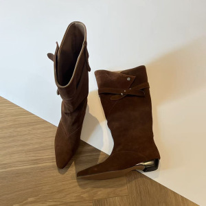 羊皮版~2025秋冬新款小方头粗跟中筒靴美拉德短靴翻折棕色西部靴