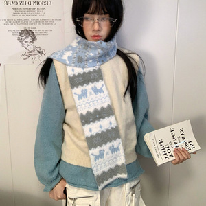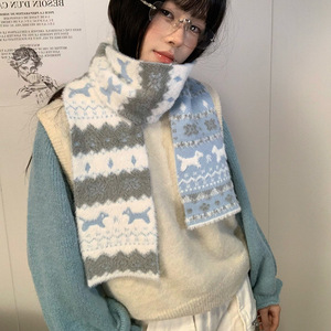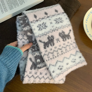 费尔岛风仿水貂绒双面针织围巾女秋冬保暖百搭卡通可爱猫咪狗围脖