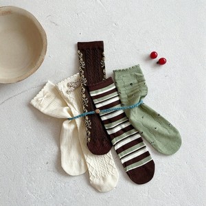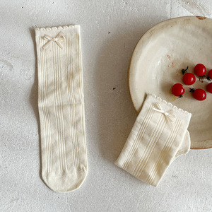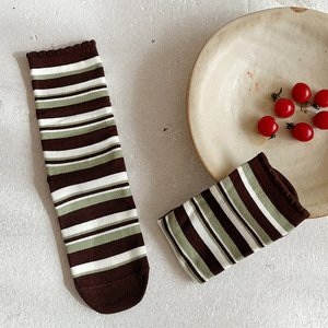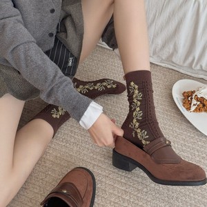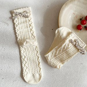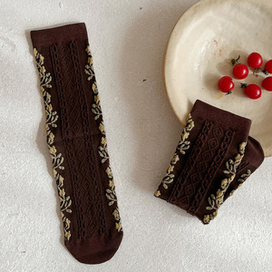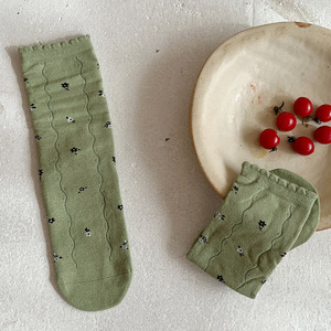 咖色复古文艺风蝴蝶结袜子女春秋绿色森系碎花甜美浮雕花纹中筒袜