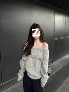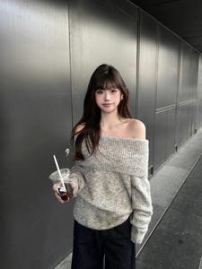 灰色露肩韩系套头毛衣女秋冬慵懒风宽松气质小个子长袖一字肩上衣