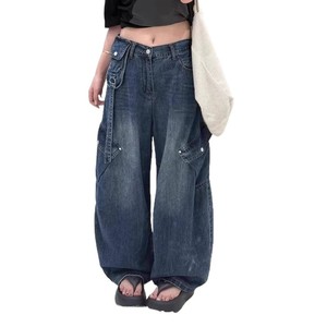 美式设计感工装弯刀牛仔裤女秋季2025新款高腰宽松阔脚休闲拖地裤