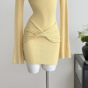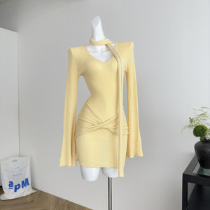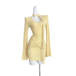 攻心曲线AYA*V领针织喇叭袖连衣裙飘带收腰包臀短裙