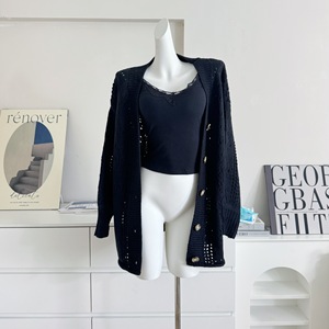 杏色镂空针织开衫女早秋2025新款宽松休闲外套