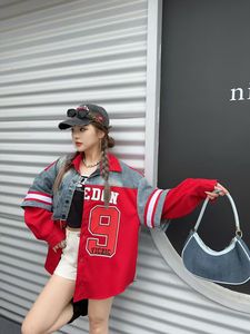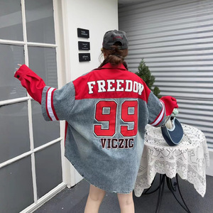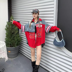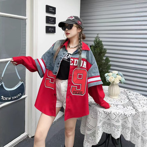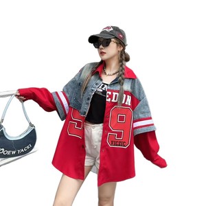 欧货撞色牛仔衬衫女2025秋季新款个性99数字母印花假两件潮牌外套