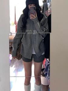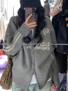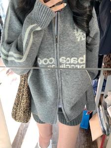 HUOTONG棒球风翻领拉链毛衣开衫女外套秋装新款韩版宽松针织衫