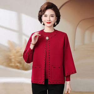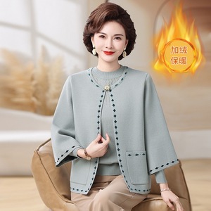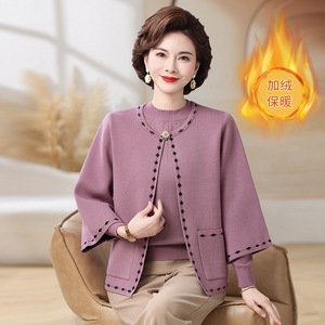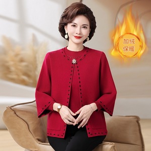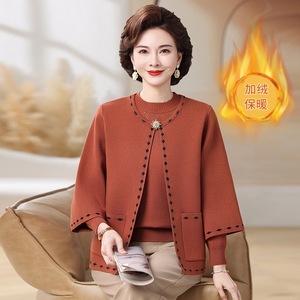 妈妈秋装新款针织两件套装上衣中老年女秋冬加绒加厚外套毛衣开衫