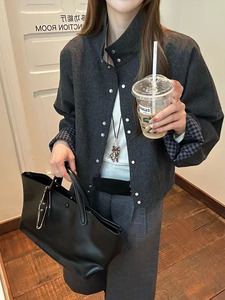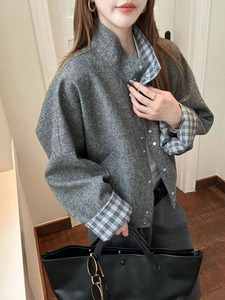 2025秋季新款时尚气质立领撞色袖子拼接格子设计感外套女百搭上衣