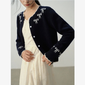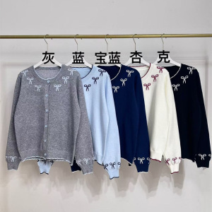 韩版慵懒软糯撞色蝴蝶结保暖毛衣开衫女秋新款显瘦外搭上衣