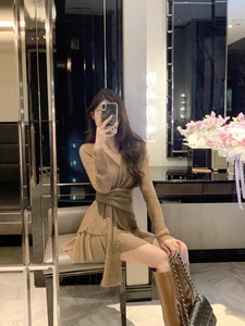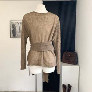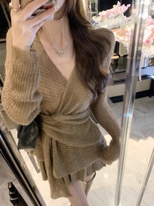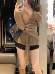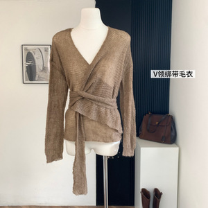 焦糖漫2025新款秋装羊毛针织衫V领上衣绑带毛衣女外套