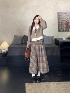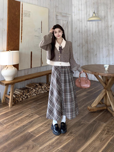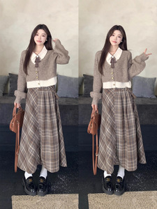 大码女装美拉德风学院Polo领针织毛衣+温柔格纹半裙