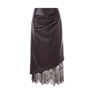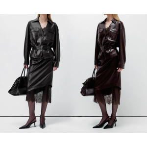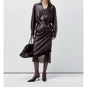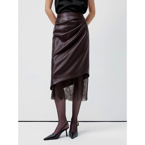 现货厂家批发 2025新款纯色 不规则蕾丝PU皮裙女复古褶皱半身长裙