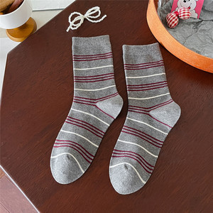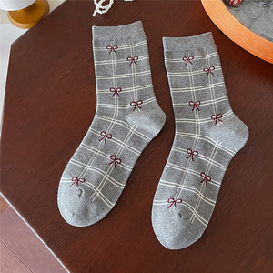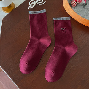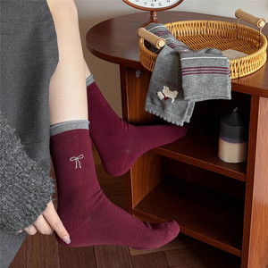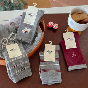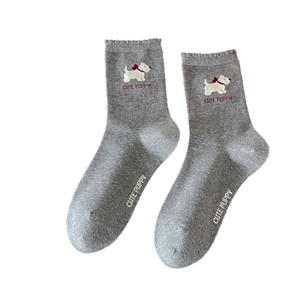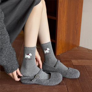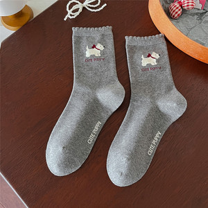 秋冬无骨韩国风袜子女miu系安可拉红卡通小狗蝴蝶结精梳棉中筒袜