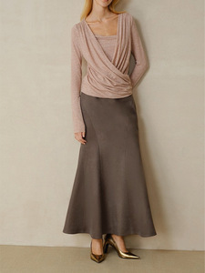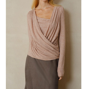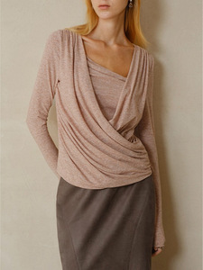 苎麻混纺假两件立体剪裁交叉褶皱荡领针织上衣