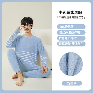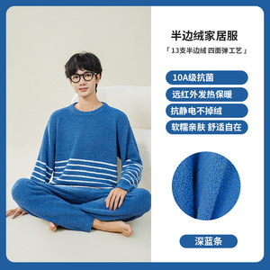 青少年半边绒睡衣男款冬季加厚男高中生圆领套头慵懒风家居服套装