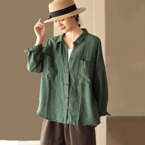文艺复古棉麻长袖衬衫春秋季新款百搭宽松显瘦POLO领洋气减龄女装