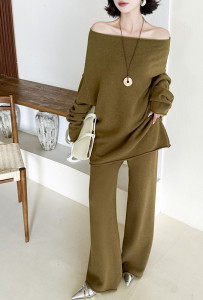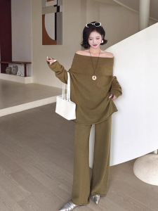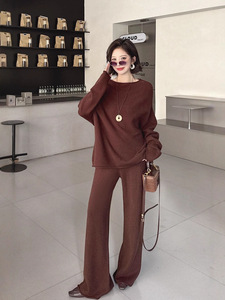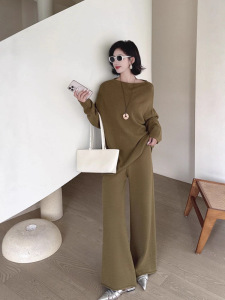 跨境秋冬温柔气质针织时尚套装一字圆领毛衣新款针织阔腿裤两件套