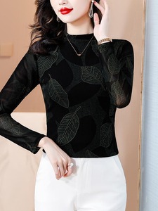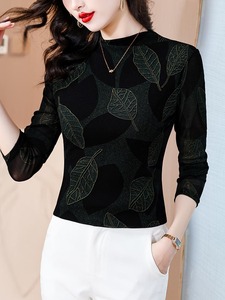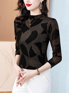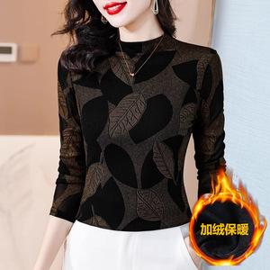中年妈妈半高领印花网纱长袖打底衫女秋冬季加绒内搭小衫洋气上衣