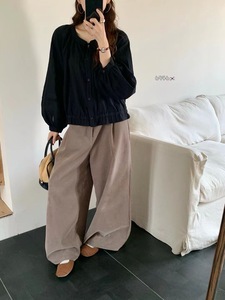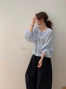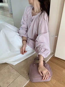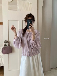 2025韩系甜美气质插肩系带圆领长袖衬衫上衣简约文艺宽松泡泡袖