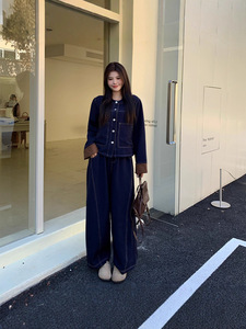 大码女装牛仔套装女2025秋季新款盐系高级感圆领外套阔腿裤两件套