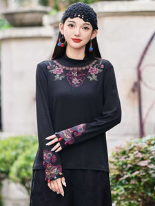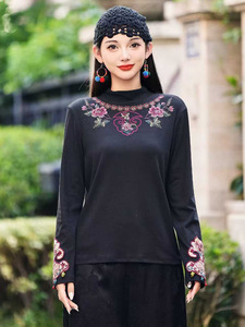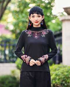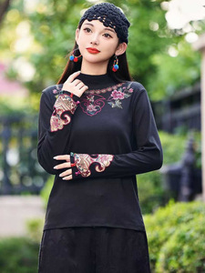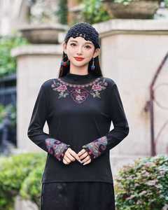 黑色国风女内搭2025秋长袖拼接刺绣女式莫代尔棉上衣打底衫