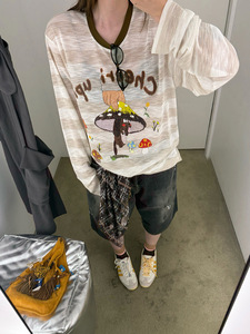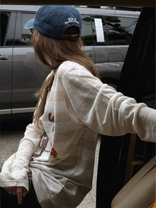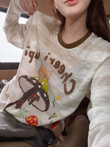 闲暇周末~韩代款白咖色圆领长袖T恤女 2025秋宽松慵懒感卡通罩衫