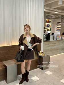 2025秋季中长款韩系大翻领撞色系通勤百搭显瘦时尚收腰风衣外套