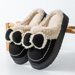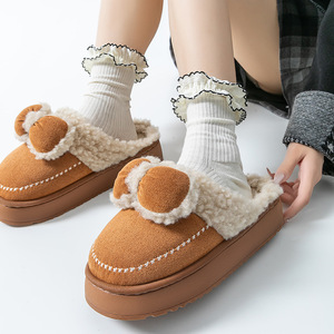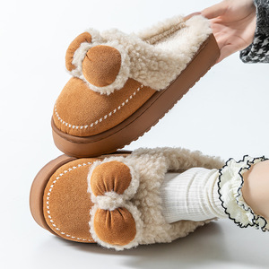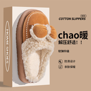 蝴蝶结棉拖鞋女款居家冬季保暖月子鞋室内厚底防滑包头毛绒拖鞋女
