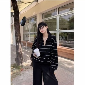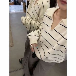 2025秋冬新款大码法式别致宽松慵懒风长袖条纹针织衫女