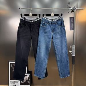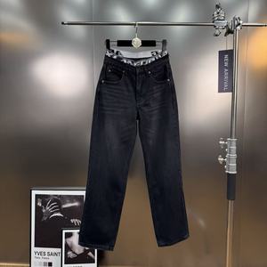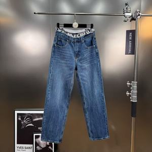 美式复古风字母松紧腰拼接设计感假两件直筒牛仔裤