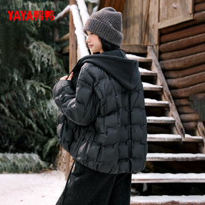 鸭鸭轻薄羽绒服女2025秋冬新品小个子短款针织拼接连帽保暖外套J
