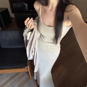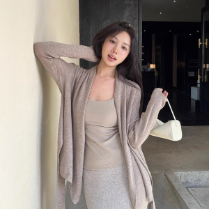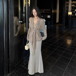 实拍慵懒风绑带设计羊毛开衫女秋季中长款气质外套长裙背心三件套