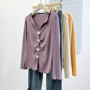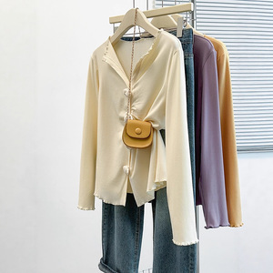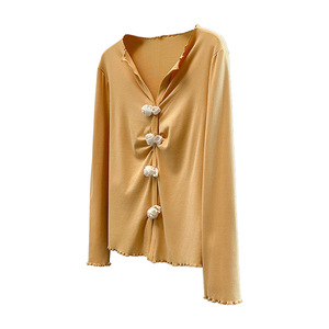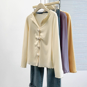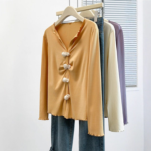 2025秋季新款胖mm大码女立体花扣褶皱修身显瘦长袖针织打底衫