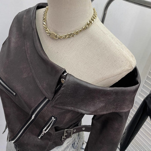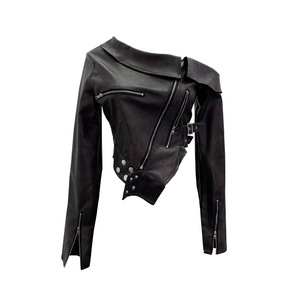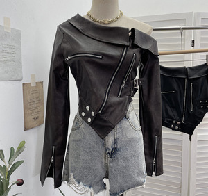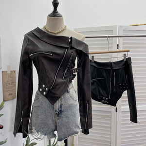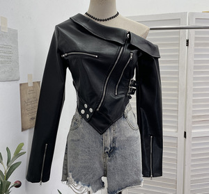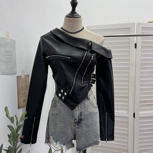 实拍短款斜肩小皮衣外套女pu皮酷飒不规则小个子拉链机车上衣2786