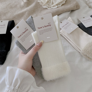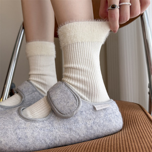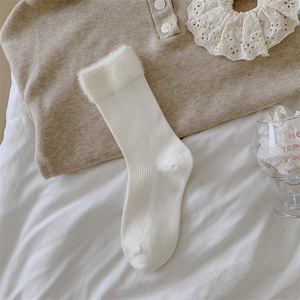 韩系秋冬新款双针绒毛口百搭舒适休闲中筒袜子女日系简约无骨袜